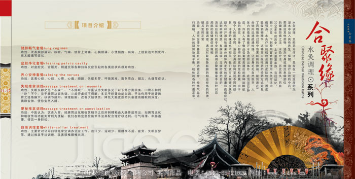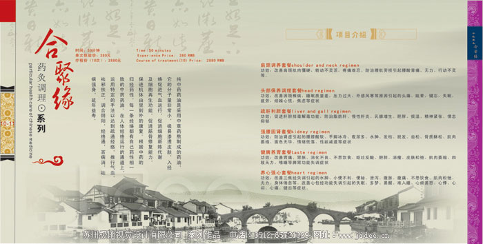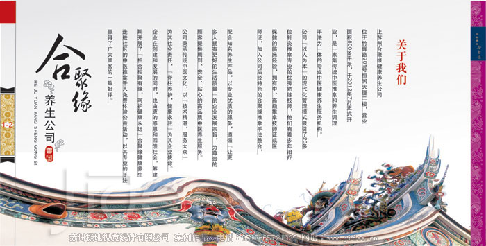 客戶名稱:蘇州合聚緣健康養(yǎng)生公司 行業(yè)類別:美容養(yǎng)生 項(xiàng)目分類:畫冊(cè)設(shè)計(jì)|企業(yè)畫冊(cè)設(shè)計(jì)|產(chǎn)品畫冊(cè)設(shè)計(jì)|宣傳冊(cè)設(shè)計(jì) 項(xiàng)目介紹: 蘇州合聚緣健康養(yǎng)生公司位于竹輝路201號(hào)恒潤大廈二樓,營業(yè)面積800多平米,于2012年8月正式開業(yè),是一家集傳統(tǒng)中醫(yī)推拿和養(yǎng)生調(diào)理手法為一體的專業(yè)中醫(yī)健康養(yǎng)生服務(wù)機(jī)構(gòu)。公司“以人為本”的現(xiàn)代化管理模式吸引了20多位針灸推拿專業(yè)的優(yōu)秀熟練技師,他們有著多年治療保健的臨床經(jīng)驗(yàn)…