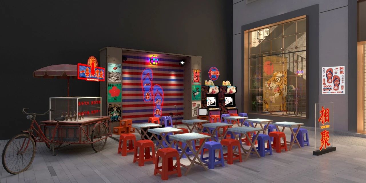 喜茶,一個(gè)被奶茶事業(yè)耽誤的設(shè)計(jì)公司,胡子,一個(gè)為五條人打造靈魂海報(bào)的設(shè)計(jì)師,同樣是誕生于廣東獨(dú)有的文化之下,這兩者相遇,會(huì)迸發(fā)出怎樣的火花呢?一喜行街主題海報(bào):海報(bào)延續(xù)了喜茶一貫的風(fēng)格,紅與藍(lán)的配色打造復(fù)古、簡(jiǎn)約的意象,而“人字拖”、“牌匾”等元素,是五條人海報(bào)最常用到的東西,海報(bào)排版也似五條人海報(bào)一樣隨性。海報(bào)文案的粵語諧音也非常有趣:一喜睇(dì)戲、、一喜唱K、一喜發(fā)財(cái)、一喜飲茶、一喜宵夜、一喜旅行,體現(xiàn)了年輕人自由灑脫的生活態(tài)度。如果說上面兩幅海報(bào)代表 “白天”,那么下面這兩幅 “霓虹” 版的海報(bào)就帶我們開啟了 “夜晚” 模式。同樣的設(shè)計(jì),因?yàn)轭伾牟煌o觀眾的感覺也截然不同。喜茶的手提袋與奶茶杯一直都是他們的品牌亮點(diǎn),將全新的設(shè)計(jì)融入包裝上面,再次展現(xiàn)了喜茶品牌設(shè)計(jì)的多元化。精致、小資的喜茶門店視覺,結(jié)合“紅白藍(lán)編織袋”背景墻,折疊桌、紅藍(lán)塑料凳等大排檔元素,這波反差,真是令人大開眼界這樣聲勢(shì)浩大的跨界。