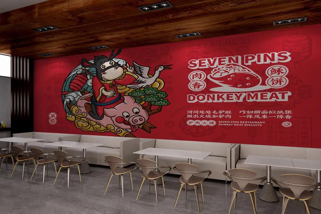 品牌根據品類塑造了一個驢IP,擬人化處理后的驢IP,形態更接近Q版,兩只驢耳朵向外伸展,隨著表情動作向上或向下伸展,很是靈動。傳統服飾在身,對驢肉火燒的歷史悠久進行不經意的刻畫。驢IP拿著不同的東西做出不同的動作時,形象就變得年輕起來了,十分有趣。驢IP與青龍、鯉魚、嫩豬以及小雞等具有中式代表性的動物進行搭配,創作出一幅幅國潮風插畫,是對美好寓意的向往和憧憬,也突出品牌的包容性和多樣性特點。品牌的輔助圖形就比較常見了,從標志和IP中延展,與文案和簡筆食材、菜品結合,以此更好的宣傳柒品食府這個品牌。