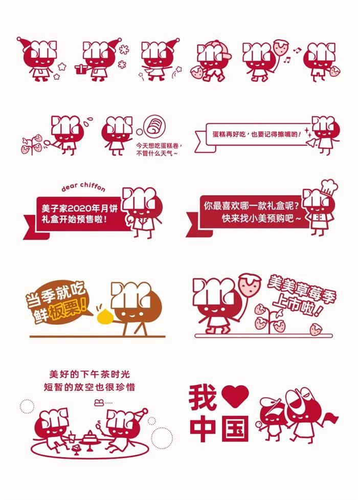 這個叫美子家蛋糕的烘焙品牌是以創始人的名字來命名的,主打法式甜品。升級后的LOGO,色調調整為雅致的紅白色,并塑造了一個可愛的IP形象作為LOGO的圖案。以品牌的主推產品蛋糕卷的形狀來設計字體,多個拐彎處體現著蛋糕卷的渾圓,同時字體的部分扁平的線條突顯現代化的浪漫。除了紅色和白色,品牌也融入了黑色的色調,對于多樣化和層次感的體現有著很大的幫助。品牌塑造的IP形象,以蛋糕卷切面的圓潤形狀為頭的部分,代表美子和美好祝福的英文“M”與之巧妙結合,擬人化處理成人的劉海,并加入開心的表情,整體形象很可愛、親切、溫暖。不同字母的劉海造型,為品牌的多IP化打下基礎,更加豐滿IP的形象。IP的身體部分由簡約的線條搭建,線條多變,幻化為多種形象,賦予IP人物的多面性,增添趣味感,觸發消費者的感性萌點,也讓人物更容易被識別。品牌采用了“綬帶”作為輔助圖形,綬帶是香港小姐授勛時斜掛在肩上的綢帶,以此加深美的概念。