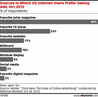 2012十月美國互聯(lián)網(wǎng)用戶喜歡看廣告的媒介比例