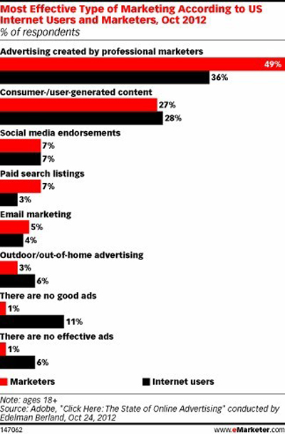 營銷人員和消費(fèi)者對(duì)于各項(xiàng)廣告形式有效性的評(píng)估比例