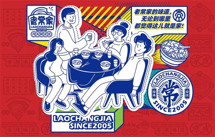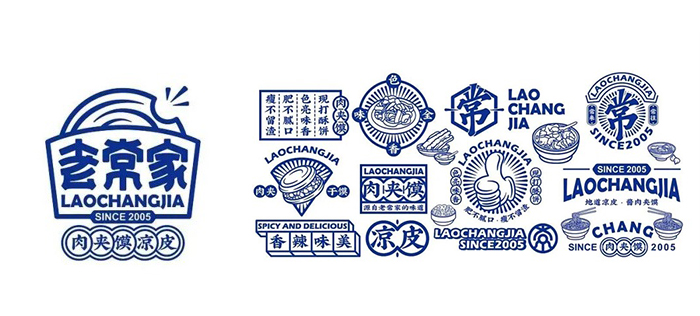 老常家肉夾饃,緣起于地道陜西美食,幾十年來堅持手工打饃,精選優(yōu)質(zhì)上等好豬肉每日小伙慢燉,饃焦香酥脆,肉肥而不膩,瘦而不柴。此次品牌設(shè)計是對老常家品牌的15年經(jīng)營的一個提升。LOGO的形狀是一塊出爐打包好的肉夾饃,饃被咬了一個小口,包裝紙平面里置放著老常家三字,字體線條下意識往下垂凹,使其與其他字體樣式區(qū)別開來,品類標(biāo)識用多個圓圈圈起來,對應(yīng)上肉夾饃的形狀。輔助圖形利用標(biāo)志和品類結(jié)合幾何圖形來塑造,是當(dāng)下眾多餐飲品牌會使用的一種輔助圖形設(shè)計方式,意在更好的傳達(dá)品牌的優(yōu)勢和賣點(diǎn)。