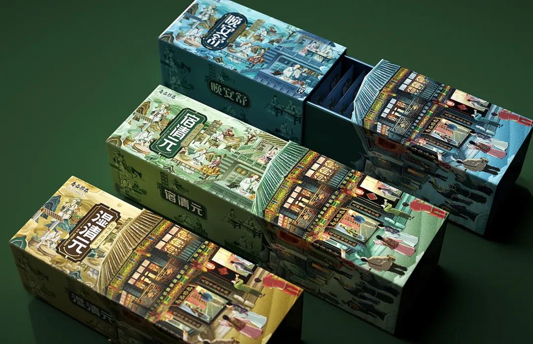 外盒包裝以藥都里仁街為背景,提煉里仁街、中醫館及華佗等的代表元素,構建一個傳統中醫館的形象,特定場景的畫面布局體現了華佗的養生茶工藝,進一步塑造產品關聯性。同時為了區分養生茶品類,外觀采用三種清雅古韻的性質用色,結合立體感十足的插畫,將元素融合成獨特的有文化承載的視覺符號,打造一款差異化的養生茶產品形象。