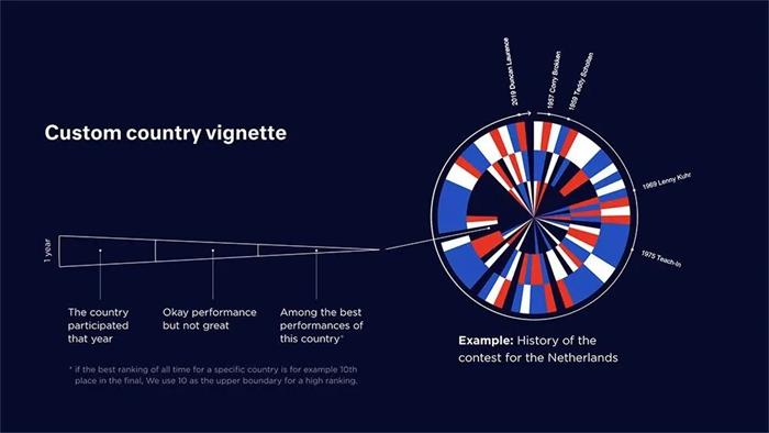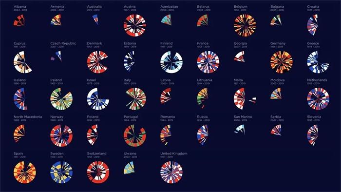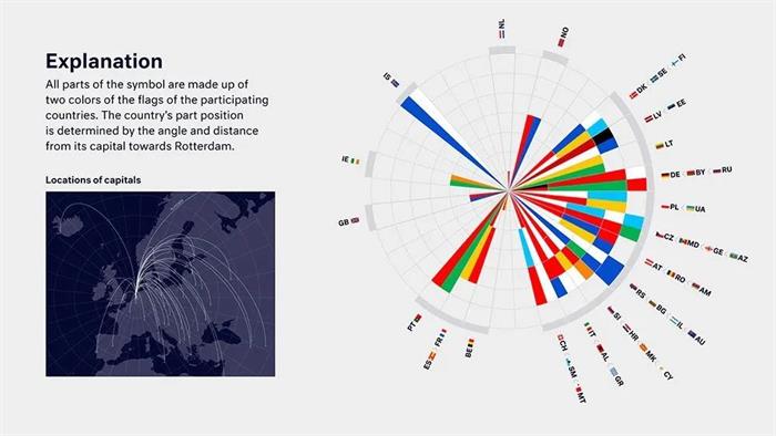 在去年的LOGO設計中,設計師以參賽順序的41個國家的國旗顏色進行提取,運用圖形形成一個圓形數據圖表,從而展現出歌唱大賽的歷史數據。