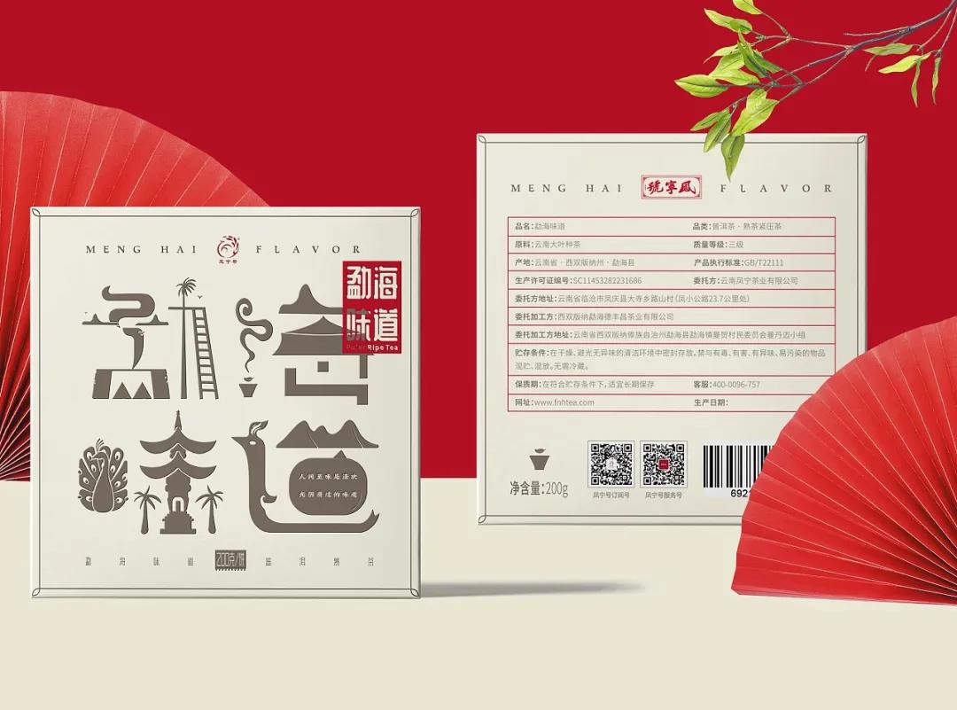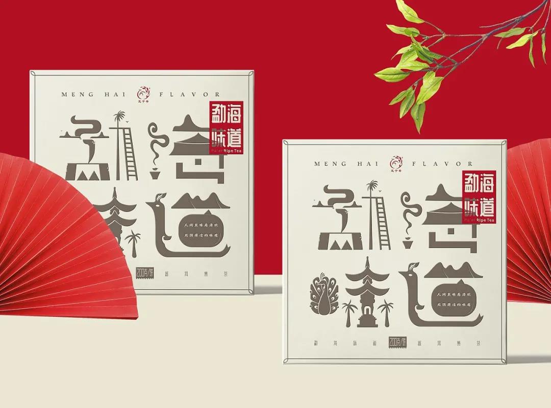 這款勐海味道茶葉包裝,整體以米色調進行畫面鋪設,封面的字體設計,巧妙融入了當?shù)氐慕ㄖ⒖兹浮釒е参锏龋癸@茶品名稱的同時,使得畫面表達更具美感。