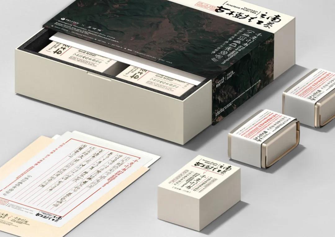 先來看有點浪漫的手工情書系列,原木色的禮盒包裝,奠定了整體歲月靜好般的小資情懷,輔以沉黑色的山景圖腹帶標簽貼,很好地平衡了視覺層次。另外封面還設有古老的漢字書體,重點突出茶葉的產(chǎn)地等信息,呼應了品牌的“手工情書”系列,增強整體的文化底蘊。