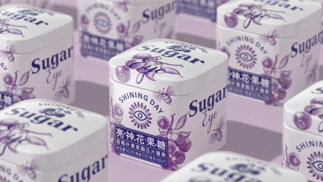 鐵罐盒的小巧包裝方便用戶隨時攜帶,另外在琳瑯滿目的貨架陳列上,結合整潔清爽的畫面設計,用戶也能迅速捕捉鐵罐的糖果屬性,進一步突出產品的健康、優質。外盒包裝延續一致的風格,居中排版的人眼睛巧妙結合了太陽元素,如同正放射光芒的熾烈陽光,突出了產品“護眼”的功能屬性,進一步強化人們對“保健類”糖果的印象。