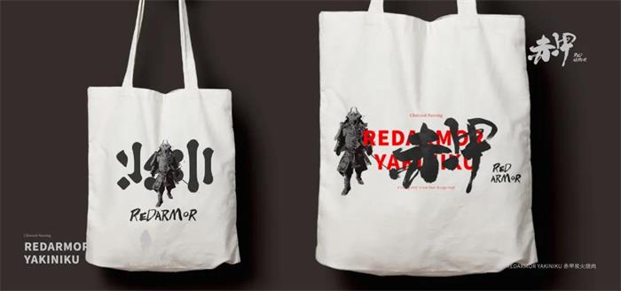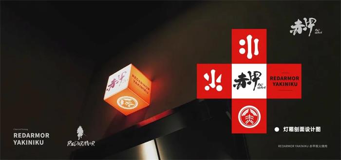 赤甲是一個(gè)開(kāi)在廣州的日式燒肉品牌,這一名稱是從火焰和武士中汲取靈感,餐廳定位為武士意志的炭火燒肉店。濃墨的毛筆揮斥出赤甲二字,力道十足,像武士揮刀時(shí)的決絕;炭火燒肉的品類標(biāo)識(shí)居于右下角,同樣也是用毛筆書(shū)寫(xiě),看起來(lái)很統(tǒng)一。品牌的主色調(diào)為紅色,與炭火燒肉的品類屬性契合,黑灰的輔助色,很好地刻畫(huà)了武士的形象。